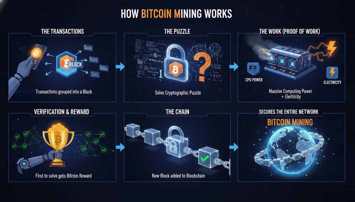 Bitcoin mining serves two primary purposes: it validates transactions and creates new Bitcoin. When someone sends Bitcoin to another person, that transaction needs to be confirmed as legitimate before it becomes permanent on the blockchain. Miners group these transactions into blocks and compete to solve a mathematical puzzle to add those blocks to the chain. This process is called “proof of work” because miners must demonstrate that they have expended significant computational effort to solve the puzzle.