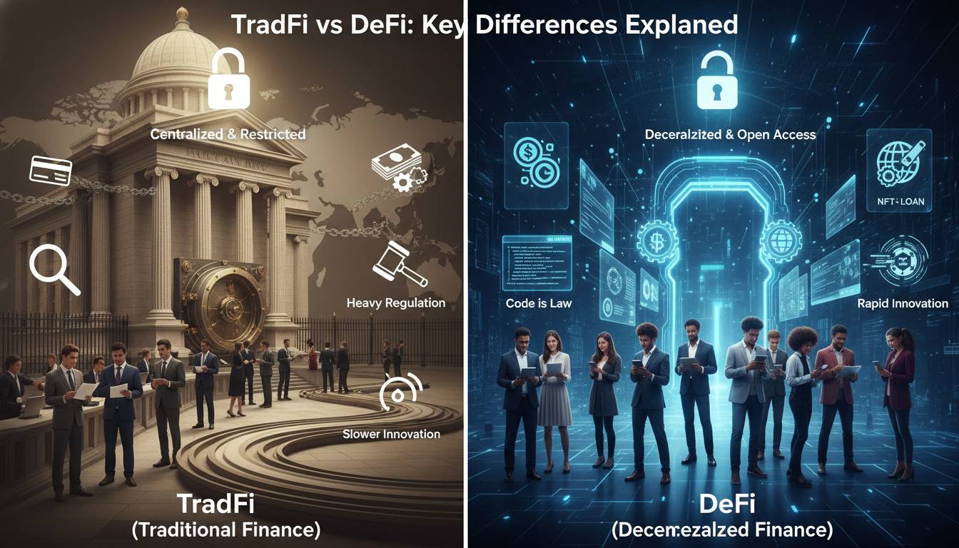 QUICK ANSWER: TradFi (Traditional Finance) refers to the established banking system with centralized institutions like banks, brokerages, and exchanges that operate through intermediaries, government oversight, and physical infrastructure. DeFi (Decentralized Finance) uses blockchain technology to enable peer-to-peer financial transactions without intermediaries, relying on smart contracts, cryptocurrency, and decentralized protocols for lending, borrowing, trading, and earning interest.