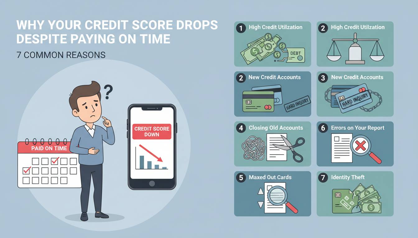 SUMMARY: Your credit score can drop despite on-time payments due to high credit utilization (over 30%), new credit inquiries, closing credit cards, credit report errors, becoming an authorized user on an account with negative history, medical debt in collections, and changes in credit mix or account age. Payment history only represents 35% of your FICO score—the other 65% involves factors that can change rapidly.
